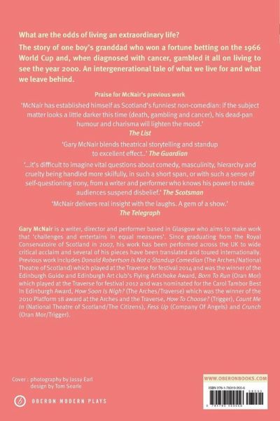 What are the odds of living an extraordinary life? This is the story of one boy's granddad who won a fortune betting on the 1966 World Cup and, when diagnosed with cancer, gambled it all on living to see the year 2000. An intergenerational tale of what we live for and what we leave behind. Gary McNair and director Gareth Nicholls return to the Traverse after last year's award-winning, fivestar showDonald Robertson Is Not A Stand-Up Comedian.