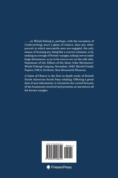 It's almost impossible to imagine spending eight months at sea "without once putting foot on land." But that's exactly what whalers experienced when playing the dangerous "game of chance," hunting down leviathans for oil and bone-all for a "lay," or share, of the vessel's spoils. A Game of Chance is the first comprehensive, in-depth study of British North American South Seas whaling. Author Andrea Kirkpatrick takes readers on a series of fascinating and sometimes fantastical journeys as she chronicles in great detail the story of a largely forgotten industry that operated out of Nova Scotia and New Brunswick ports from the 1760s to 1850. Kirkpatrick plumbed the depths of myriad logbooks and journals to piece together the often-murky tales of an astonishing number of ships. In this treatise covering a century of whaling, she shares details such as ownership, tonnage, voyages, captains' pedigrees, and names of crewmen, including nascent whaler Herman Melville, author of Moby-Dick. Hoping for "greasy luck," the men who manned these ships found both camaraderie and competition as they hunted the world's whaling grounds from Cape Horn to Kamchatka, many circumnavigating the globe during their careers. They battled squalls and high seas, scurvy and venereal disease, heartbreak and homesickness-and sometimes each other. Many never returned home, their bodies committed to the deep or buried on foreign land. Written in two parts-landward and seaward-Kirkpatrick's clear prose and adoption of whaling lingua franca brings this high-risk venture to the fore with authenticity, newly revealed facts, and remarkable stories of adventure.