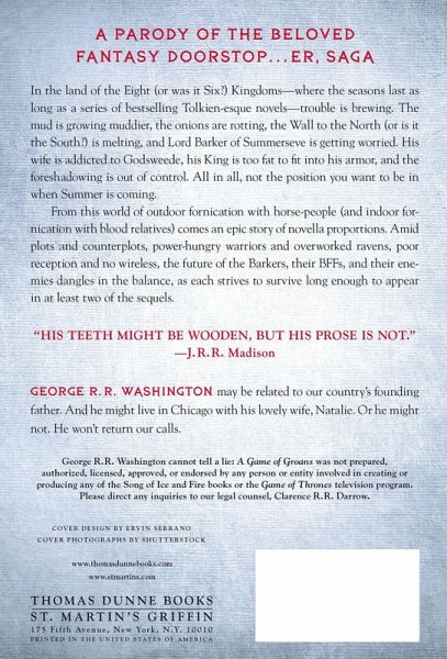 A PARODY OF THE BELOVED FANTASY DOORSTOP... ER, SAGA In the land of the Eight (or was it Six?) Kingdoms-where the seasons last as long as a series of bestselling Tolkien-esque novels-trouble is brewing. The mud is growing muddier, the onions are rotting, the Wall to the North (or is it the South?) is melting, and Lord Barker of Summerseve is getting worried. His wife is addicted to Godsweede, his King is too fat to fit into his armor, and the foreshadowing is out of control. All in all, not the position you want to be in when Summer is coming. From this world of outdoor fornication with horse-people (and indoor fornication with blood relatives) comes an epic story of novella proportions. Amid plots and counterplots, power-hungry warriors and overworked ravens, poor reception and no wireless, the future of the Barkers, their BFFs, and their enemies dangles in the balance, as each strives to survive long enough to appear in at least two of the sequels. "His teeth might be wooden, but his prose is not." ---J.R.R. Madison George R. R. Washington cannot tell a lie: A Game of Groans was not prepared, authorized, licensed, approved, or endorsed by any person or entity involved in creating or producing any of the Song of Ice and Fire books or the Games of Throne television program. Please direct any inquiries to our legal counsel, Clarence R. R. Darrow.