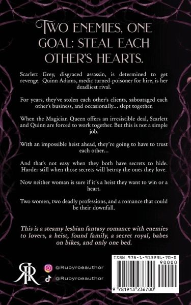 Two enemies, one goal: steal each other's hearts. Scarlett Grey, disgraced assassin, is determined to get revenge. Quinn Adams, medic turned-poisoner for hire, is her deadliest rival. For years, they've stolen each other's clients, sabotaged each other's business, and occasionally... slept together. When the Magician Queen offers an irresistible deal, Scarlett and Quinn are forced to work together. But this is not a simple job. With an impossible heist ahead, they're going to have to trust each other... And that's not easy when they both have secrets to hide. Harder still when those secrets will betray the ones they love. Now neither woman is sure if it's a heist they want to win or a heart. Two women, two deadly professions, and a romance that could be their downfall. This is a steamy lesbian fantasy romance with enemies to lovers, a heist, found family, a secret royal, and only one bed.