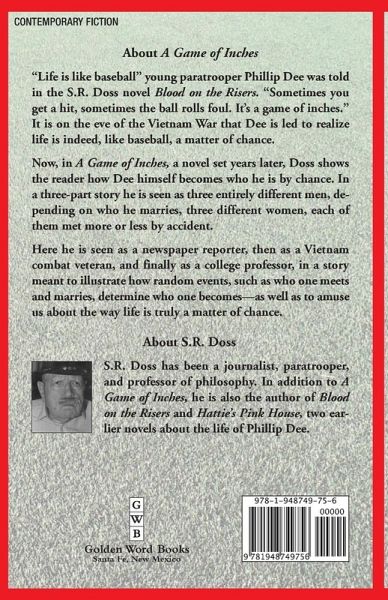 "Life is like baseball" young paratrooper Phillip Dee was told in the S.R. Doss novel Blood on the Risers. "Sometimes you get a hit, sometimes the ball rolls foul. It's a game of inches." It is on the eve of the Vietnam War that Dee is led to realize life is indeed, like baseball, a matter of chance. Now, in A Game of Inches, a novel set years later, Doss shows the reader how Dee himself becomes who he is by chance. In a three-part story he is seen as three entirely different men, depending on who he marries, three different women, each of them met more or less by accident. Here he is seen as a newspaper reporter, then as a Vietnam combat veteran, and finally as a college professor, in a story meant to illustrate how random events, such as who one meets and marries, determine who one becomes-as well as to amuse us about the way life is truly a matter of chance.