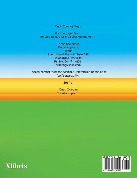 Capt. Cowboy Says: If you enjoyed Vol. I, Be sure to look for Fruit and Friends Vol. II. These fine books Come to you by Xlibris Xlibris Corporation International Plaza II, Suite 340 Philadelphia, PA 19113 Tel. No. 1-888-795-4274 orders@xlibris.com Please contact them for additional information on the next Vol.'s availability. See Ya! Capt. Cowboy Thanks to you....
