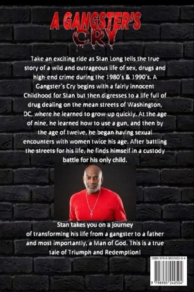 Take an exciting ride as Stan Long tells the true story of a wild and outrageous life of sex, drugs and high-end crime during the 1980's & 1990's. A Gangster's Cry begins with a fairly innocent childhood for Stan but then digresses to a life full of drug dealing on the mean streets of Washington, DC, where he learned to grow-up quickly. At the age of nine, he learned how to use a gun, and then by the age of twelve, he began having sexual encounters with women twice his age. After battling the streets for his life, he finds himself in a custody battle for his only child. Stan takes you on a journey of transforming his life from a gangster to a father and most importantly, a Man of God. This is a true tale of Triumph and Redemption!