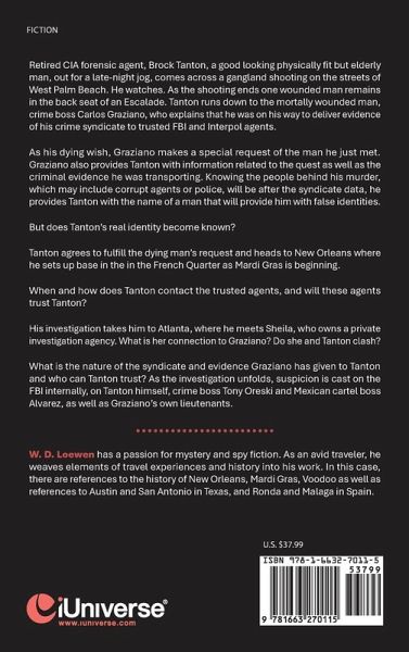 Retired CIA forensic agent, Brock Tanton, a good looking physically fit but elderly man, out for a late-night jog, comes across a gangland shooting on the streets of West Palm Beach. He watches. As the shooting ends one wounded man remains in the back seat of an Escalade. Tanton runs down to the mortally wounded man, crime boss Carlos Graziano, who explains that he was on his way to deliver evidence of his crime syndicate to trusted FBI and Interpol agents. As his dying wish, Graziano makes a special request of the man he just met. Graziano also provides Tanton with information related to the quest as well as the criminal evidence he was transporting. Knowing the people behind his murder, which may include corrupt agents or police, will be after the syndicate data, he provides Tanton with the name of a man that will provide him with false identities. But does Tanton's real identity become known? Tanton agrees to fulfill the dying man's request and heads to New Orleans where he sets up base in the in the French Quarter as Mardi Gras is beginning. When and how does Tanton contact the trusted agents, and will these agents trust Tanton? His investigation takes him to Atlanta, where he meets Sheila, who owns a private investigation agency. What is her connection to Graziano? Do she and Tanton clash? What is the nature of the syndicate and evidence Graziano has given to Tanton and who can Tanton trust? As the investigation unfolds, suspicion is cast on the FBI internally, on Tanton himself, crime boss Tony Oreski and Mexican cartel boss Alvarez, as well as Graziano's own lieutenants.