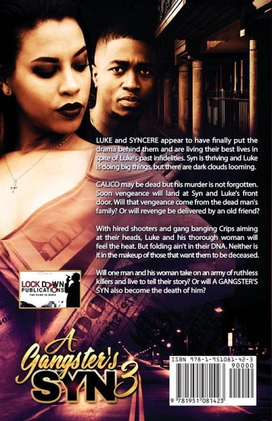LUKE and SYNCERE appear to have finally put the drama behind them and are living their best lives in spite of Luke's past infidelities. Syn is thriving and Luke is doing big things, but there are dark clouds looming. CALICO may be dead but his murder is not forgotten. Soon vengeance will land at Syn and Luke's front door. Will that vengeance come from the dead man's family? Or will revenge be delivered by an old friend? With hired shooters and gang banging Crips aiming at their heads, Luke and his thorough woman will feel the heat. But folding ain't in their DNA. Neither is it in the makeup of those that want them to be deceased. Will one man and his woman take on an army of ruthless killers and live to tell their story? Or will A GANGSTER'S SYN also become the death of him?