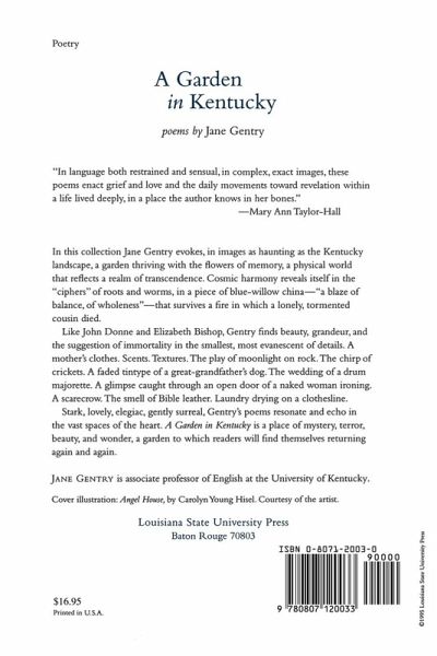 In this collection Jane Gentry evokes, in images as haunting as the Kentucky landscape, a garden thriving with the flowers of memory, a physical world that reflects a realm of transcendence. In this garden, cosmic harmony reveals itself in the "ciphers" of roots and worms, in a piece of blue willow china-"a blaze of balance, of wholeness"-that survives a fire in which a lonely, tormented neighbor died. The white sheets crack in the wind, fat bellies of sails sweet as round stomachs of children. Stark, lovely, elegiac, gently surreal, Gentry's poems resonate and echo in the vast spaces of the heart; long after being read, lines return, lines like those of the lovely "In the Moment of My Death (For My Father)" that beg to be memorized: In the moment of my death may your old happiness light my way; and the image of your face smiling, happy at my coming, be a lantern in the dark. The taste of desire, the pang of remembered loss, the sorrow of leaving a house-Jane Gentry has found a way to make these things new. A Garden in Kentucky is a place of mystery, terror, beauty, and wonder, a garden to which readers will find themselves retuning again and again.