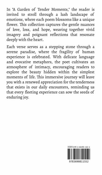 In "A Garden of Tender Moments," the reader is invited to stroll through a lush landscape of emotions, where each poem blossoms like a unique flower. This collection captures the gentle nuances of love, loss, and hope, weaving together vivid imagery and poignant reflections that resonate deeply with the heart. Each verse serves as a stepping stone through a serene paradise, where the fragility of human experience is celebrated. With delicate language and evocative metaphors, the poet cultivates an atmosphere of intimacy, encouraging readers to explore the beauty hidden within the simplest moments of life. This immersive journey will leave you with a renewed appreciation for the tenderness that exists in our daily encounters, reminding us that every fleeting experience can sow the seeds of enduring joy.