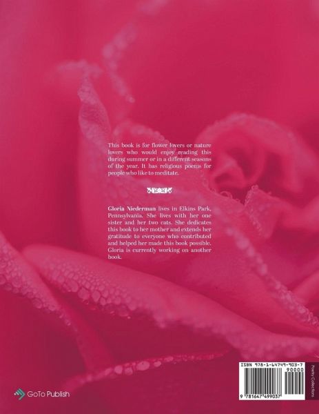 This book is for flower lovers or nature lovers who would enjoy reading this during summer or in a different seasons of the year. It has religious poems for people who like to meditate. Gloria Niederman lives in Elkins Park, Pennsylvania. She lives with her one sister and her two cats. She dedicates this book to her mother and extends her gratitude to everyone who contributed and helped her made this book possible. Gloria is currently working on another book.