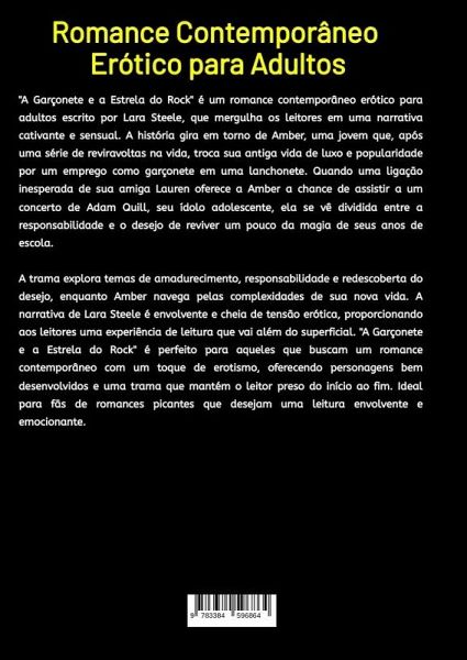 "A Garçonete e a Estrela do Rock" é um romance contemporâneo erótico para adultos escrito por Lara Steele, que mergulha os leitores em uma narrativa cativante e sensual. A história gira em torno de Amber, uma jovem que, após uma série de reviravoltas na vida, troca sua antiga vida de luxo e popularidade por um emprego como garçonete em uma lanchonete. Quando uma ligação inesperada de sua amiga Lauren oferece a Amber a chance de assistir a um concerto de Adam Quill, seu ídolo adolescente, ela se vê dividida entre a responsabilidade e o desejo de reviver um pouco da magia de seus anos de escola.A trama explora temas de amadurecimento, responsabilidade e redescoberta do desejo, enquanto Amber navega pelas complexidades de sua nova vida. A narrativa de Lara Steele é envolvente e cheia de tensão erótica, proporcionando aos leitores uma experiência de leitura que vai além do superficial. "A Garçonete e a Estrela do Rock" é perfeito para aqueles que buscam um romance contemporâneo com um toque de erotismo, oferecendo personagens bem desenvolvidos e uma trama que mantém o leitor preso do início ao fim. Ideal para fãs de romances picantes que desejam uma leitura envolvente e emocionante.
