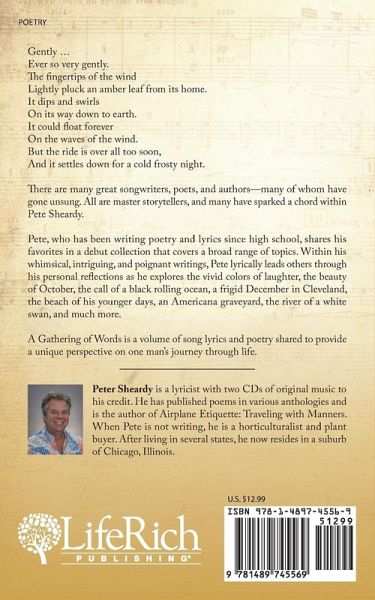 Gently ... Ever so very gently. The fingertips of the wind Lightly pluck an amber leaf from its home. It dips and swirls On its way down to earth. It could float forever On the waves of the wind. But the ride is over all too soon, And it settles down for a cold frosty night. There are many great songwriters, poets, and authors-many of whom have gone unsung. All are master storytellers, and many have sparked a chord within Pete Sheardy. Pete, who has been writing poetry and lyrics since high school, shares his favorites in a debut collection that covers a broad range of topics. Within his whimsical, intriguing, and poignant writings, Pete lyrically leads others through his personal reflections as he explores the vivid colors of laughter, the beauty of October, the call of a black rolling ocean, a frigid December in Cleveland, the beach of his younger days, an Americana graveyard, the river of a white swan, and much more. A Gathering of Words is a volume of song lyrics and poetry shared to provide a unique perspective on one man's journey through life.