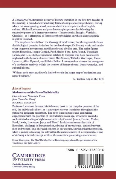 A Geneology of Modernism is a study of literary transition in the first two decades of this century, a period of extraordinary ferment and great accomplishment, during which the avant-garde gradually consolidated a secure place within English culture. Michael Levenson analyses that complex process by following the successive phases of a literary movement - Impressionist, Imagist, Vorticist, Classicist - as it attempted to formulate the principles on which a new aesthetic might be founded. The emphasis here falls on the ideology of modernism, but throughout the book the ideological question is tied on the one hand to specific literary works and on the other to general movements in philosophy and the fine arts. The major figures under discussion, Joseph Conrad, Ford Madox Ford, Ezra Pound, Wyndham Lewis, and T. S. Elliot, are placed in relation to thinkers who have been largely neglected in the history of modernism: Max Stirner, Wilhelm Worringer, Pierre Lasserre, Allen Upward, and Hilaire Belloc. Levenson thus situates the emergence of a modernist aesthetic within the context of literary theory, literary practice, and cultural history.
