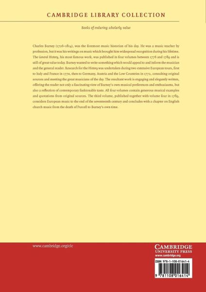 Charles Burney (1726-1814), was the foremost music historian of his day. The General History, his most famous work, was published in four volumes between 1776 and 1789 and is still of great value today. Burney wanted to write something which would appeal to and inform the musician and the general reader. Research for the History was undertaken during two European tours, in 1770 and 1772, consulting original sources and meeting the great musicians of the time. The resultant work is engaging and elegantly written, offering the reader a fascinating view not only of Burney's own musical preferences and enthusiasms, but also a reflection of contemporary fashionable taste. All four volumes contain generous musical examples, quotations from original sources and an index. The third volume, published 1789, considers European music to the end of the seventeenth century and English church music from the death of Purcell to Burney's time.