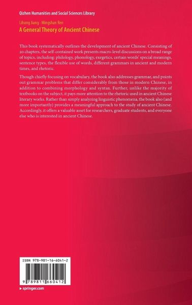 This book systematically outlines the development of ancient Chinese. Consisting of 20 chapters, the self-contained work presents macro-level discussions on a broad range of topics, including: philology, phonology, exegetics, certain words' special meanings, sentence types, the flexible use of words, different grammars in ancient and modern times, and rhetoric.