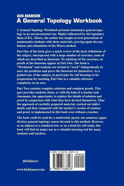 This book has been called a Workbook to make it clear from the start that it is not a conventional textbook. Conventional textbooks proceed by giving in each section or chapter first the definitions of the terms to be used, the concepts they are to work with, then some theorems involving these terms (complete with proofs) and finally some examples and exercises to test the readers' understanding of the definitions and the theorems. Readers of this book will indeed find all the conventional constituents--definitions, theorems, proofs, examples and exercises but not in the conventional arrangement. In the first part of the book will be found a quick review of the basic definitions of general topology interspersed with a large num ber of exercises, some of which are also described as theorems. (The use of the word Theorem is not intended as an indication of difficulty but of importance and usefulness. ) The exercises are deliberately not "graded"-after all the problems we meet in mathematical "real life" do not come in order of difficulty; some of them are very simple illustrative examples; others are in the nature of tutorial problems for a conven tional course, while others are quite difficult results. No solutions of the exercises, no proofs of the theorems are included in the first part of the book-this is a Workbook and readers are invited to try their hand at solving the problems and proving the theorems for themselves.