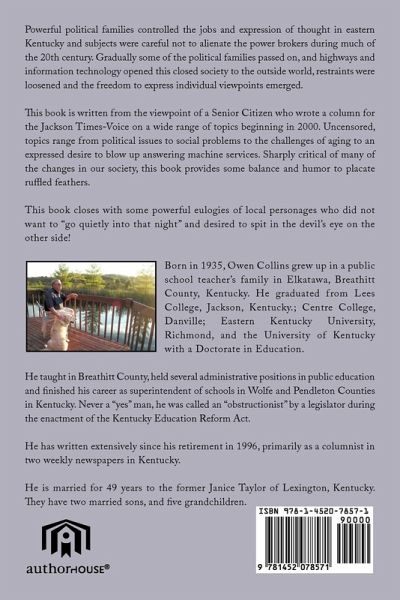Powerful political families controlled the jobs and expression of thought in eastern Kentucky and subjects were careful not to alienate the power brokers during much of the 20thtwentieth century. Gradually some of the political families passed on, and highways and information technology opened this closed society to the outside world, restraints were loosened and the freedom to express individual viewpoints emerged. This book is written from the viewpoint of a Senior Citizen who wrote a column for the Jackson Times-Voice on a wide range of topics beginning in 2000. Uncensored, topics range from political issues to social problems to the challenges of aging to an expressed desire to blow up answering menus. Sharply critical of many of the changes in our society, this book provides some balance and humor to placate ruffled feathers. This book closes with some powerful eulogies of local personages who did not want to "go quietly into that night" and desired to spit in the devil's eye on the other side!