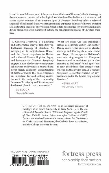 A Generous Symphony offers a balanced appraisal of Balthasars literary achievement and explicates Balthasars literary criticism as a distinctive theology of revelation, which offers possibilities for understanding how divine presence may be manifested outside the canonical boundaries of Christian tradition. The structure of A Generous Symphony is a chronological presentation of the Balthasarian canon of imaginative literature, which allows readers to see how social and historical interests guide Balthasars readings in the pre-Christian, medieval, and modern eras. While other books have examined the systematic theology of Balthasar, this book will examine the important question of how students of literature, like Balthasar, can be transformed into theologians by attending to the implicit presence of Christ in what Gerard Manley Hopkins poem As kingfishers catch fire . . . called the ten thousand places. Balthasars deep investment in the uniqueness of Christian revelation is underlined, while, at the same time, his aesthetic sympathies cause him to invest literature with quasi-sacramental status.