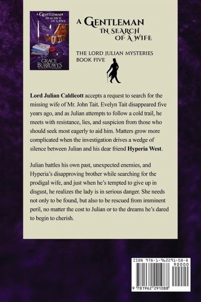 Lord Julian Caldicott accepts a request to search for the missing wife of Mr. John Tait. Evelyn Tait disappeared five years ago, and as Julian attempts to follow a cold trail, he meets with resistance, lies, and suspicion from those who should seek most eagerly to aid him. Matters grow more complicated when the investigation drives a wedge of silence between Julian and his dear friend Hyperia West. Julian battles his own past, unexpected enemies, and Hyperia's disapproving brother while searching for the prodigal wife, and just when he's tempted to give up in disgust, he realizes the lady is in danger. She needs not only to be found, but also to be rescued from imminent peril, no matter the cost to Julian or to the dreams he's dared to begin to cherish.
