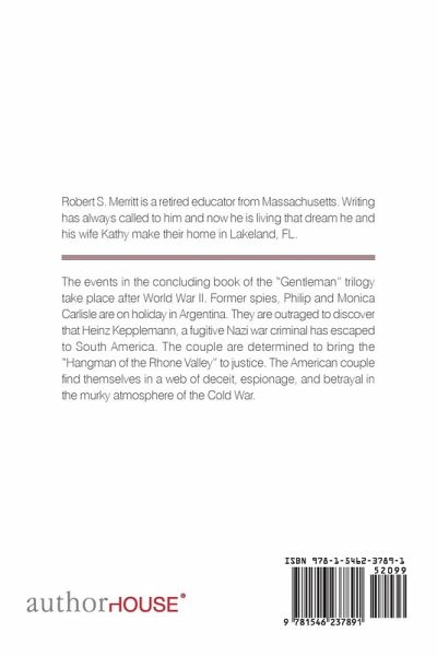 The events in the concluding book of the Gentleman trilogy take place after World War II. Former spies, Philip and Monica Carlisle are on holiday in Argentina. They are outraged to discover that Heinz Kepplemann, a fugitive Nazi war criminal has escaped to South America. The couple are determined to bring the Hangman of the Rhone Valley to justice. The American couple find themselves in a web of deceit, espionage, and betrayal in the murky atmosphere of the Cold War.