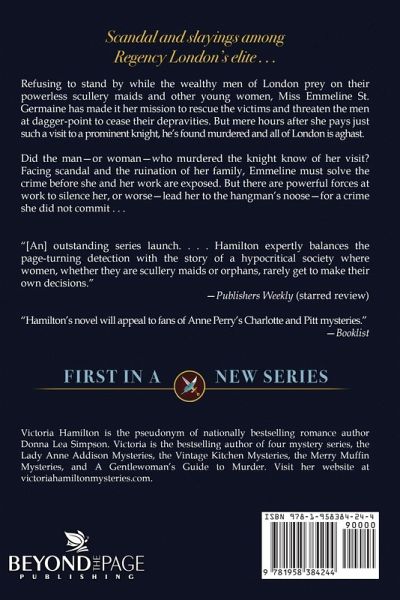 Scandal and slayings among Regency London's elite . . . Refusing to stand by while the wealthy men of London prey on their powerless scullery maids and other young women, Miss Emmeline St. Germaine has made it her mission to rescue the victims and threaten the men at dagger-point to cease their depravities. But mere hours after she pays just such a visit to a prominent knight, he's found murdered and all of London is aghast. Did the man-or woman-who murdered the knight know of her visit? Facing scandal and the ruination of her family, Emmeline must solve the crime before she and her work are exposed. But there are powerful forces at work to silence her-or worse, lead her to the hangman's noose for a crime she did not commit . . .