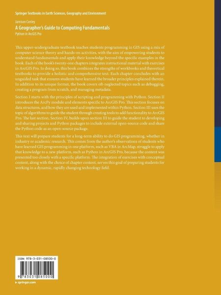 This upper-undergraduate textbook teaches students programming in GIS using a mix of computer science theory and hands-on activities, with the aim of empowering students to understand fundamentals and apply their knowledge beyond the specific examples in the book. Each of the book's twenty-one chapters integrates instructional material with exercises in ArcGIS Pro. In doing so, this book combines the strengths of workbooks and theoretical textbooks to provide a holistic and comprehensive text. Each chapter concludes with an unguided task that ensures students have learned the broader principles explained therein. In addition to its unique format, the book covers oft-neglected topics such as debugging, creating a program from scratch, and managing metadata.