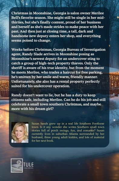 Christmas in Moonshine, Georgia is salon owner Merilee Bell's favorite season. She might still be single in her mid- thirties, but she's finally content, proud of her business and herself as she's made strides to make peace with her past. And then just at closing time, a tall, dark and handsome new deputy enters her shop, and everything seems poised to change. Weeks before Christmas, Georgia Bureau of Investigation agent, Randy Slade arrives in Moonshine posing as Moonshine's newest deputy for an undercover sting to catch a group of high-tech property thieves. Only the sheriff is aware of his true identity, but from the moment he meets Merilee, who trades a haircut for free parking, he's smitten by her smile and warm, friendly manner. Unfortunately, she also has a rental property perfectly suited for his undercover operation. Randy doesn't want to lie, but he has a duty to keep citizens safe, including Merilee. Can he do his job and still celebrate a small town southern Christmas, and maybe more with his dream girl?