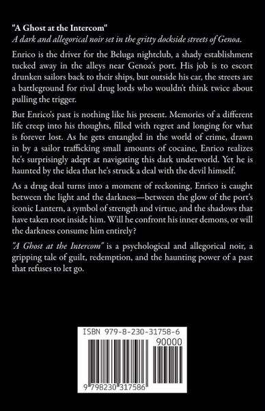 "A Ghost at the Intercom" A dark and allegorical noir set in the gritty dockside streets of Genoa. Enrico is the driver for the Beluga nightclub, a shady establishment tucked away in the alleys near Genoa's port. His job is to escort drunken sailors back to their ships, but outside his car, the streets are a battleground for rival drug lords who wouldn't think twice about pulling the trigger. But Enrico's past is nothing like his present. Memories of a different life creep into his thoughts, filled with regret and longing for what is forever lost. As he gets entangled in the world of crime, drawn in by a sailor trafficking small amounts of cocaine, Enrico realizes he's surprisingly adept at navigating this dark underworld. Yet he is haunted by the idea that he's struck a deal with the devil himself. As a drug deal turns into a moment of reckoning, Enrico is caught between the light and the darkness-between the glow of the port's iconic Lantern, a symbol of strength and virtue, and the shadows that have taken root inside him. Will he confront his inner demons, or will the darkness consume him entirely? "A Ghost at the Intercom" is a psychological and allegorical noir, a gripping tale of guilt, redemption, and the haunting power of a past that refuses to let go.