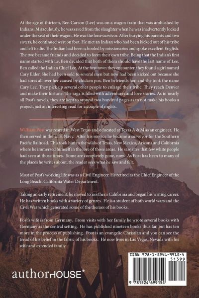 At the age of thirteen, Ben Carson (Lee) was on a wagon train that was ambushed by Indians. Miraculously, he was saved from the slaughter when he was inadvertently locked under the seat of their wagon. He was the lone survivor. After burying his parents and two sisters, he continued west on foot. He met an Indian who had been kicked out of his tribe and left to die. The Indian had been schooled by missionaries and spoke excellent English. The two became friends and decided to form their own tribe. Being that the Indian's first name started with Le, Ben decided that both of them should have the last name of Lee. Ben called the Indian Chief Lee. At the first town they encounter, they found a girl named Cary Elder. She had been sold to several men but now had been kicked out because she had sores all over her caused by chicken pox. Ben befriends her, and she took the name Cary Lee. They pick up several other people to enlarge their tribe. They reach Denver and make their fortune. The saga is filled with adventures and love stories. As in nearly all Post's novels, they are kept to around two hundred pages as to not make his books a project, just an interesting read for a couple of nights.