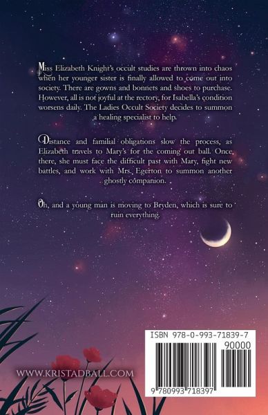Miss Elizabeth Knight's occult studies are thrown into chaos when her younger sister is finally allowed to come out into society. There are gowns and bonnets and shoes to purchase. However, all is not joyful at the rectory, for Isabella's condition worsens daily. The Ladies Occult Society decides to summon a healing specialist to help. Distance and familial obligations slow the process, as Elizabeth travels to Mary's for the coming out ball. Once there, she must face the difficult past with Mary, fight new battles, and work with Mrs. Egerton to summon another ghostly companion. Oh, and a young man is moving to Bryden, which is sure to ruin everything.