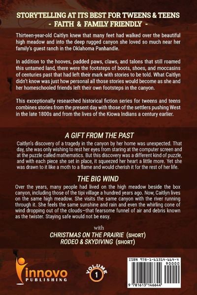 -ABOUT THE BOOK: A GIFT FROM THE PAST (Story 1) Caitlyn's discovery of a tragedy in the canyon by her home was unexpected. That day, she was only wishing to rest her eyes from staring at the computer screen and at the puzzle called mathematics. But this discovery was a different kind of puzzle, and with each piece she set in place, it squeezed her heart a little more. Yet she was drawn to it like a moth to a flame and would cherish it for the rest of her life. THE BIG WIND (Story 2) Over the years, many people had lived on the high meadow beside the box canyon, including those of the tipi village a hundred years ago. Now, thirteen-year-old Caitlyn lives on the same high meadow. She visits the same canyon with the river running through it. She feels the same sunshine and rain and even the whirling cone of wind dropping out of the clouds-that fearsome funnel of air and debris known as the twister. Staying safe would not be easy. -ABOUT THE AUTHOR: Ms. Joann Klusmeyer is the daughter of pioneer missionary parents. She grew up in rural Arkansas and learned and served in the little country church her father built and then pastored. She later moved to Oklahoma and now resides in an area settled by the Great Land Rush of 1889. Ms. Klusmeyer is a prolific author with over 50 titles to her credit (and counting). Her family-friendly children's book series include The Great I AM Bible Story Series for Kids, The Young Pioneers Adventure Series for Kids, The Wentworth Triplets Mystery Series for Young Teens, and Footsteps in the Canyon Adventure Series for Young Teens. Ms. Klusmeyer's historical fiction series for adults, set between the 1880s and the 1920s, include The Burnt Tree Junction Series, The Ozark Mountain Series, Taming the Wilderness Series, The Sheltering Stones Series, and The Trilogy of Wishbone Hollow. ¿-ABOUT THE PUBLISHER: Innovo Publishing LLC is a Christian publisher located near Memphis, TN. Since 2008, Innovo has been publishing quality books, eBooks, audiobooks, music, screenplays, film, and online and physical curricula that support the Great Commission, equip believers, and help create a positive Christian worldview. Innovo's capabilities and global reach provide Christian authors, artists, and ministries access to the world for Christ. To learn more about Innovo Publishing, visit our website at innovopublishing.com. To connect with other Christian Creatives and to learn best