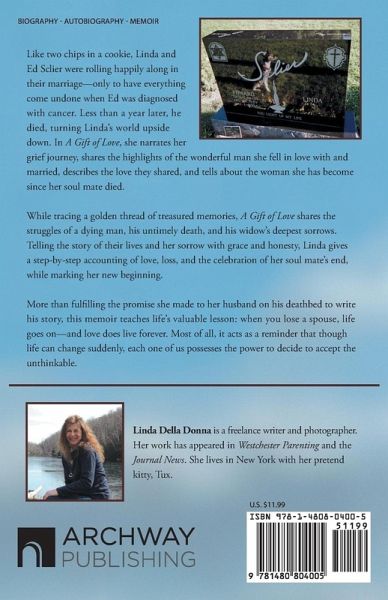 Like two chips in a cookie, Linda and Ed Sclier were rolling happily along in their marriage-only to have everything come undone when Ed was diagnosed with cancer. Less than a year later, he died, turning Linda's world upside down. In A Gift of Love, she narrates her grief journey, shares the highlights of the wonderful man she fell in love with and married, describes the love they shared, and tells about the woman she has become since her soul mate died. While tracing a golden thread of treasured memories, A Gift of Love shares the struggles of a dying man, his untimely death, and his widow's deepest sorrows. Telling the story of their lives and her sorrow with grace and honesty, Linda gives a step-by-step accounting of love, loss, and the celebration of her soul mate's end, while marking her new beginning. More than fulfilling the promise she made to her husband on his deathbed to write his story, this memoir teaches life's valuable lesson: when you lose a spouse, life goes on-and love does live forever. Most of all, it acts as a reminder that though life can change suddenly, each one of us possesses the power to decide to accept the unthinkable.