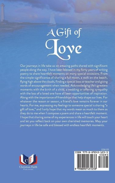 Our journeys in life take us on amazing paths shared with significant people along the way. I have been blessed in my forty years of writing poetry to share heartfelt moments on many special occasions. From the simple significance of sharing a full moon, a walk on the beach, flying high above the clouds, finding a special boss or teacher and giving words of encouragement when needed. Acknowledging life's greatest moments with the birth of a child, a wedding or offering sympathy with the loss of a loved one have all been opportunities of inspiration. Along with the importance of friendships that help shape our lives. For whatever the reason or season, a friend's love remains forever in our hearts. For me, expressing my feelings to someone special is sharing "a gift of love," and I only hope that my words mean as much to them as they do to me when I compose a poem and share a heartfelt moment. I hope that sharing some of my experiences in life will touch your heart and let you reflect back on your own cherished memories. May your journeys in life be safe and blessed with endless heartfelt moments.