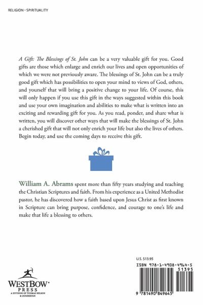 A Gift: The Blessings of St. John can be a very valuable gift for you. Good gifts are those which enlarge and enrich our lives and open opportunities of which we were not previously aware. The blessings of St. John can be a truly good gift which has possibilities to open your mind to views of God, others, and yourself that will bring a positive change to your life. Of course, this will only happen if you use this gift in the ways suggested within this book and use your own imagination and abilities to make what is written into an exciting and rewarding gift for you. As you read, ponder, and share what is written, you will discover other ways that will make the blessings of St. John a cherished gift that will not only enrich your life but also the lives of others. Begin today, and use the coming days to receive this gift.