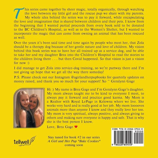 This series came together kind of by accident, totally organically, through watching the love between my little girl and the rescue pup we share with my parents. The whole idea behind the series was to pay it forward, while capturing the love and imagination that is shared between children and their pets. I knew from the beginning that I wanted partial proceeds from every book sold to be donated to the BC Children's Hospital and to the Royal LePage Shelter Foundation (Women's Shelter), but I wanted to incorporate the magic that can come for children from spending time with an animal as well. Over the years it's been said time and time again by people who meet her that Zola should be a therapy dog because of her gentle nature and love of children. The vision was to get Zola all trained up as a service dog, and be able to take her into Children's Hospital to read the books to the children staying there. But then Covid happened, so that vision is just a vision for now. We will just have to wait and see what it all evolves into! Please check out our Instagram, @agirlandherpupbooks, for updates on money raised. Thank you so much for your support! Xo~ Geralynn Gage