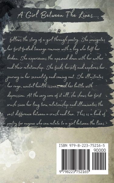 A Girl Between The Lines follows the story of a girl through poetry. She navigates her first failed teenage romance with a boy who left her broken. She experiences the ups and down with her mother and their relationship. She finds herself and explores her journey in her sexuality and coming out. She illustrates her rage, mental health issues, and her battle with depression. At the very core of it all, she shows her first crush since her long term relationship and illuminates the vast difference between a crush and love. This is a book of poetry for anyone who can relate to a girl between the lines.