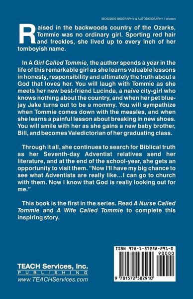 Raised in the backwoods country of the Ozarks, Tommie was no ordinary girl. Sporting red hair and freckles, she lived up to every inch of her tomboyish name. In A Girl Called Tommie, the author spends a year in the life of this remarkable girl as she learns valuable lessons in honesty, responsibility, and ultimately the truth about a God that loves her. You will laugh with Tommie as she meets her new best friend Lucinda, a naive city girl who knows nothing about the country, and when her pet bluejay Jake turns out to be a mommy. You will sympathize when Tommie comes down with the measles, and when she learns a painful lesson about breaking in new shoes. You will smile with her as she gains a new baby brother, Bill, and becomes valedictorian of her graduating class. Through it all, she continues to search for Biblical truth as her Seventh-day Adventist relatives send her literature, and at the end of the school year, she gets an opportunity to visit them. "Now I'll have my big chance to see what Adventists are really like... I can go to church with them. Now I know that God is really looking out for me." This book is the first in the series. Read A Nurse Called Tommie and A Wife Called Tommie to complete this inspiring story.