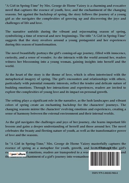"A Girl in Spring-Time" by Mrs. George de Horne Vaizey is a charming and evocative novel that captures the essence of youth, love, and the enchantment of the changing seasons. Set against the backdrop of spring, the story follows the journey of a young girl as she navigates the complexities of growing up and discovering the joys and challenges of life and love. The narrative unfolds during the vibrant and rejuvenating season of spring, symbolizing a time of renewal and new beginnings. The title "A Girl in Spring-Time" suggests that the story revolves around a young protagonist and her experiences during this season of transformation. The novel beautifully portrays the girl's coming-of-age journey, filled with innocence, curiosity, and a sense of wonder. As she interacts with the world around her, readers witness her blossoming into a young woman, gaining insights into herself and the world. At the heart of the story is the theme of love, which is often intertwined with the metaphorical imagery of spring. The girl's encounters and relationships with others, particularly with potential romantic interests, reflect the tender and delicate nature of budding emotions. Through her interactions and experiences, readers are invited to explore the complexities of young love and its impact on personal growth. The setting plays a significant role in the narrative, as the lush landscapes and vibrant colors of spring create an enchanting backdrop for the characters' journeys. The changing seasons mirror the characters' evolving emotions and experiences, creating a sense of harmony between the external environment and their internal worlds. As the girl navigates the challenges and joys of her journey, she learns important life lessons and gains a deeper understanding of herself and those around her. The novel celebrates the beauty and fleeting nature of youth, as well as the transformative power of love and the seasons. In "A Girl in Spring-Time," Mrs. George de Horne Vaizey masterfully captures the essence of spring as a metaphor for youth, growth, and love. Through the girl's experiences and emotions, readers are transported to a world of beauty, emotion, and the timeless enchantment of a girl's journey into womanhood.