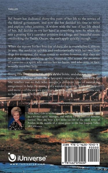 Bel Stuart has dedicated thirty-five years of her life to the service of the federal government, and now she has decided it's time to retire and explore other interests. A widow with the rest of her life ahead of her, Bel decides to try her hand at something new. So when she sees a posting for a caretaker position for a large and beautiful estate overlooking the Pacific Ocean, she can't apply quickly enough. When she reports for her first day of duty, she is overwhelmed, almost in awe. She settles in quickly and enthusiastically with her two little dogs for company; she soon comes to realize, however, that they are not alone in the rambling, gothic mansion. She senses the presence of someone-a spirit who means her no harm, and who may, in fact, actually need her help. Young Ella lived out her short life in the home, and she lost her battle to cancer at the age of ten. Now her spirit remains, desperate for help. She reaches out to Bel, who accepts a different type of caretaking assignment to help the young girl's wandering spirit. With the help-and more-of the estate's gardener, Ray, she promises to do all she can to help young Ella finally find peace.