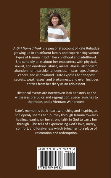 A Girl Named Trink is a personal account of Kate Rubadue, whose nickname is Trink, growing up in an affluent family and experiencing various types of trauma in both her childhood and adulthood. She candidly talks about her encounters with physical, sexual, and emotional abuse, mental illness, alcoholism, abandonment, suicidal tendencies, miscarriage, divorce, cancer, and widowhood. Kate exposes her deepest secrets, weaknesses, and brokenness, and even includes entries from her diary as an adolescent. Historical events are interwoven into her story as she witnesses southern prejudice and segregation, space launches to the moon, and a Vietnam War protest. Kate’s memoir is both heart-wrenching and inspiring as she openly shares her journey through adversity toward healing, leaning on her strong faith in God to carry her through. She tells of experiencing God’s love, mercy, comfort, and forgiveness which bring her to a place of restoration and redemption.
