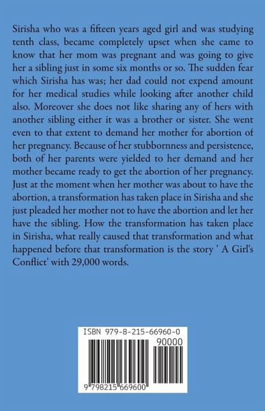 Sirisha who was a fifteen years aged girl and was studying tenth class, became completely upset when she came to know that her mom was pregnant and was going to give her a sibling just in some six months or so. The sudden fear which Sirisha has was; her dad could not expend amount for her medical studies while looking after another child also. Moreover she does not like sharing any of hers with another sibling either it was a brother or sister. She went even to that extent to demand her mother for abortion of her pregnancy. Because of her stubbornness and persistence, both of her parents were yielded to her demand and her mother became ready to get the abortion of her pregnancy. Just at the moment when her mother was about to have the abortion, a transformation has taken place in Sirisha and she just pleaded her mother not to have the abortion and let her have the sibling. How the transformation has taken place in Sirisha, what really caused that transformation and what happened before that transformation is the story ' A Girl's Conflict' with 29,000 words.