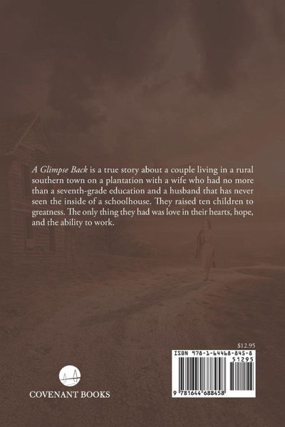 A Glimpse Back is a true story about a couple living in a rural southern town on a plantation with a wife who had no more than a seventh-grade education and a husband that has never seen the inside of a schoolhouse. They raised ten children to greatness. The only thing they had was love in their hearts, hope, and the ability to work.
