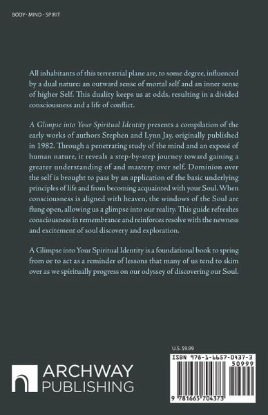 All inhabitants of this terrestrial plane are, to some degree, influenced by a dual nature: an outward sense of mortal self and an inner sense of higher Self. This duality keeps us at odds, resulting in a divided consciousness and a life of conflict. A Glimpse into Your Spiritual Identity presents a compilation of the early works of authors Stephen and Lynn Jay, originally published in 1982. Through a penetrating study of the mind and an exposé of human nature, it reveals a step-by-step journey toward gaining a greater understanding of and mastery over self. Dominion over the self is brought to pass by an application of the basic underlying principles of life and from becoming acquainted with your Soul. When consciousness is aligned with heaven, the windows of the Soul are flung open, allowing us a glimpse into our reality. This guide refreshes consciousness in remembrance and reinforces resolve with the newness and excitement of soul discovery and exploration. A Glimpse into Your Spiritual Identity is a foundational book to spring from or to act as a reminder of lessons that many of us tend to skim over as we spiritually progress on our odyssey of discovering our Soul.