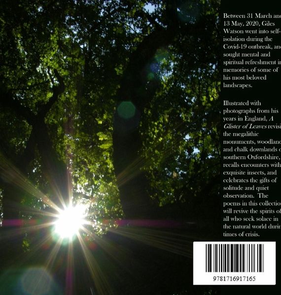Between 31 March and 13 May, 2020, Giles Watson went into self-isolation during the Covid-19 outbreak, and sought mental and spiritual refreshment in memories of some of his most beloved landscapes. Illustrated with photographs from his years in England, A Glister of Leaves revisits the megalithic monuments, woodlands and chalk downlands of southern Oxfordshire, recalls encounters with exquisite insects, and celebrates the gifts of solitude and quiet observation. The poems in this collection will revive the spirits of all who seek solace in the natural world during times of crisis.