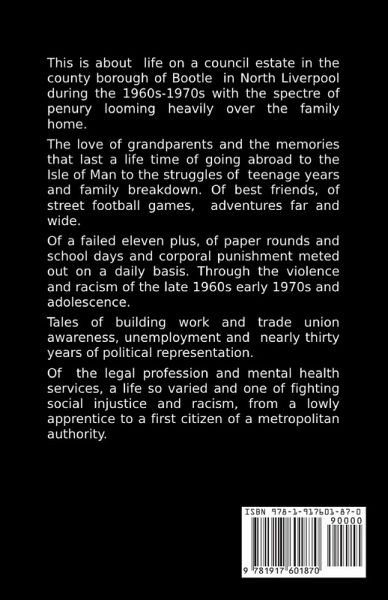 This is about life on a council estate in the county borough of Bootle in North Liverpool during the 1960s-1970s with the spectre of penury looming heavily over the family home. The love of grandparents and the memories that last a life time of going abroad to the Isle of Man to the struggles of teenage years and family breakdown. Of best friends, of street football games, adventures far and wide. Of a failed eleven plus, of paper rounds and school days and corporal punishment meted out on a daily basis. Through the violence and racism of the late 1960s early 1970s and adolescence. Tales of building work and trade union awareness, unemployment and nearly thirty years of political representation. Of the legal profession and mental health services, a life so varied and one of fighting social injustice and racism, from a lowly apprentice to a first citizen of a metropolitan authority.