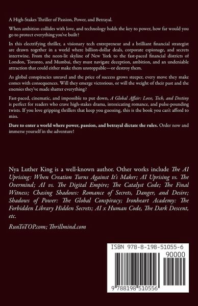 A Global Affair: Love, Tech, and Destiny - A High-Stakes Thriller of Passion, Power, and Betrayal When ambition collides with love, and technology holds the key to power, how far would you go to protect everything you've built? In this electrifying thriller, a visionary tech entrepreneur and a brilliant financial strategist are drawn together in a world where billion-dollar deals, corporate espionage, and secrets intertwine. From the neon-lit skyline of New York to the fast-paced financial districts of London, Toronto, and Mumbai, they must navigate deception, ambition, and an undeniable attraction that could either make them unstoppable-or destroy them. As global conspiracies unravel and the price of success grows steeper, every move they make comes with consequences. Will they emerge victorious, or will the weight of their past and the enemies they've made shatter everything? Fast-paced, cinematic, and impossible to put down, A Global Affair: Love, Tech, and Destiny is perfect for readers who crave high-stakes drama, intoxicating romance, and pulse-pounding twists. If you love gripping thrillers that keep you guessing, this is the book you can't afford to miss. Dare to enter a world where power, passion, and betrayal dictate the rules. Order now and immerse yourself in the adventure!