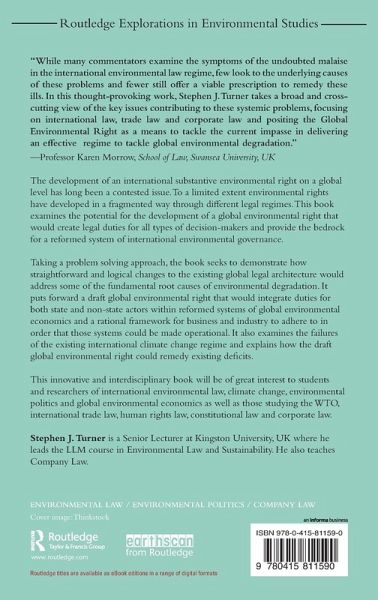 The development of an international substantive environmental right on a global level has long been a contested issue. To a limited extent environmental rights have developed in a fragmented way through different legal regimes. This book examines the potential for the development of a global environmental right that would create legal duties for all types of decision-makers relating to the environment and provide the bedrock for a reformed system of international environmental governance. Taking a problem solving approach, the book seeks to demonstrate how straightforward and logical changes to the existing global legal architecture would address some of the fundamental root causes of environmental degradation and argues for the development of a new environmental right that would create clear legal duties for all types of decision-makers. It puts forward a draft global environmental right that would integrate those duties within reformed systems of environmental governance and a rational framework for business and industry to adhere to in order that those systems could be made operational. This innovative and interdisciplinary book will be of great interest to students and researchers of international environmental law, environmental politics, environmental economics, and environmental management, as well as those studying the WTO, international trade law, human rights law, constitutional law and corporate law