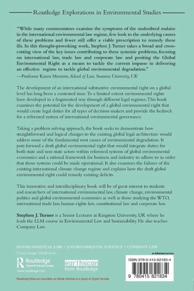 The development of an international substantive environmental right has long been a contested issue. Concurrently, environmental rights have developed in a fragmented way and to a limited extent through different legal regimes. This book examines the potential for the development of a global environmental right which would create legal duties for all decision-makers relating to the environment and provide the bedrock for a new system of international environmental governance. The book analyses not only traditional international environmental law and human rights law but also the development of corporate law, the development of the GATT and the WTO. It uses this basis to build an understanding of the wider international legal architecture and why that architecture often leads to poor outcomes for the environment. The book summarizes the state of scientific knowledge, as it is this, which drives the justification for legal reform. It also analyses existing systems that have developed within the practice of decision-making processes to demonstrate the role that they can play within new systems of environmental governance. Taking a problem solving approach, the book seeks to demonstrate how straightforward and logical changes to the architecture would solve fundamental problems and argues for the development of a new environmental right that creates clear legal responsibilities for decision-makers, illustrating how governments and institutions would need to adjust to make the changes operative and successful. This problem solving approach extends to the provision of a draft treaty annexed to the book. This innovative and interdisciplinary book is of great interest to students and researchers in international environmental law, environmental politics, environmental economics, and environmental management, as well as those studying more specifically the WTO, international trade law, human rights law, constitutional law and company law.