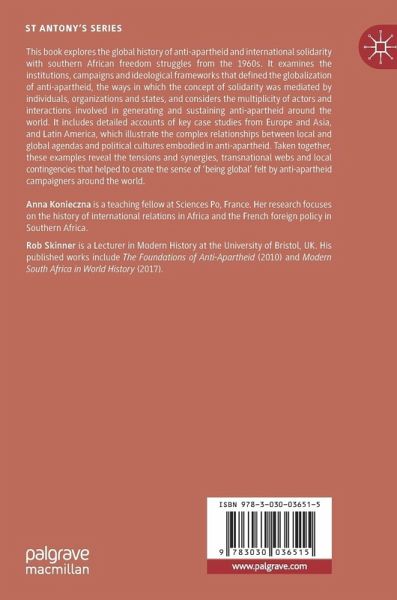 PART I - GLOBALISATION OF ANTI-APARTHEID.- Humanitarians, Human Rights and Anti-Apartheid; Rob Skinner.- 'We the people of the United Nations': The UN and the Global campaigns against Apartheid; Anna Konieczna.- From the theory to practice of liberation : Fanon, May '68 and the Black Consciousness Movement in South Africa; Namara Burki.- PART II - SOLIDARITIES.- Cuba and apartheid; Adrien Delmas.- Race, Socialism and Solidarity: Anti-Apartheid in Eastern Europe; Paul Betts, James Mark, Idesbald Goddeeris and Kim Christiaens.- PART III - LEVERS AND NETWORKS.- 'Yusuf Dadoo, India and South Africa's liberation struggle'; Arianna Lissoni.- Anti-Apartheid Goes to Brussels: Forms of Transnational Cooperation between the Anti-Apartheid Movements of the European Community Countries, 1977-1992; Lorenzo Ferrari.- Afro-Asian Solidarity and the Anti-apartheid Movement in Japan; Kumiko Makino.- Solidarity or Anti-Apartheid? The Polish opposition and South Africa, 1976-1989; Idesbald Goddeeris and Kim Christiaens.- Anti-Apartheid, Decolonization and Transnational Solidarity: the Namibian case; Chris Saunders.- Index.
