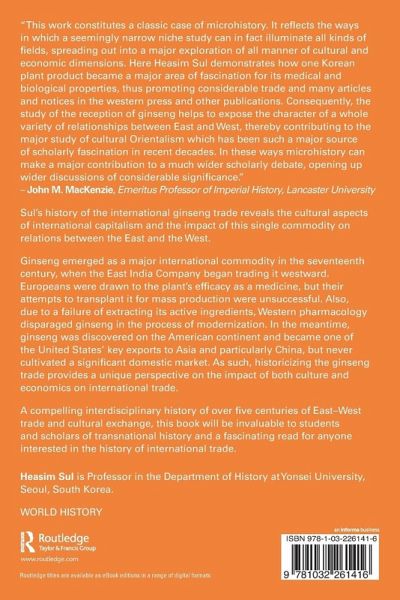 "This work constitutes a classic case of microhistory. It reflects the ways in which a seemingly narrow niche study can in fact illuminate all kinds of fields, spreading out into a major exploration of all manner of cultural and economic dimensions. Here Heasim Sul demonstrates how one Korean plant product became a major area of fascination for its medical and biological properties, thus promoting considerable trade and many articles and notices in the western press and other publications. Consequently, the study of the reception of ginseng helps to expose the character of a whole variety of relationships between East and West, thereby contributing to the major study of cultural Orientalism which has been such a major source of scholarly fascination in recent decades. In these ways microhistory can make a major contribution to a much wider scholarly debate, opening up wider discussions of considerable significance."---John M. MacKenzie, Emeritus Professor of Imperial History, Lancaster University