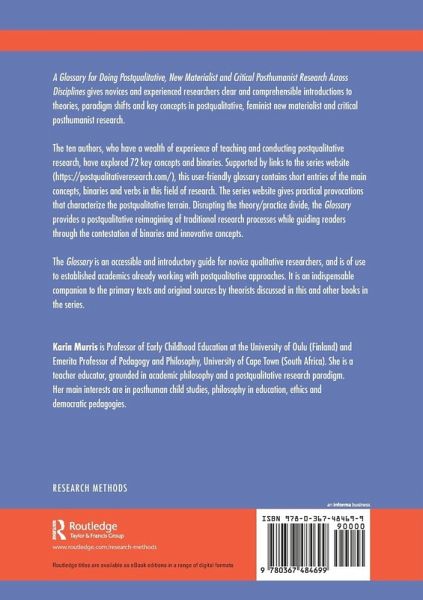 The ten authors, who have a wealth of experience of teaching and conducting postqualitative research, have explored 72 key concepts and binaries. Supported by links to the series website (https://postqualitativeresearch.com/), this user-friendly glossary contains short entries of the main concepts, binaries and verbs in this field of research. The series website gives practical provocations that characterize the postqualitative terrain. Disrupting the theory/practice divide, the Glossary provides a postqualitative reimagining of traditional research processes while guiding readers through the contestation of binaries and innovative concepts.