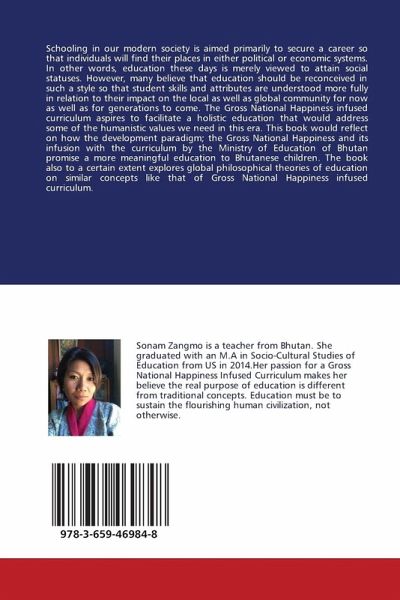 Schooling in our modern society is aimed primarily to secure a career so that individuals will find their places in either political or economic systems. In other words, education these days is merely viewed to attain social statuses. However, many believe that education should be reconceived in such a style so that student skills and attributes are understood more fully in relation to their impact on the local as well as global community for now as well as for generations to come. The Gross National Happiness infused curriculum aspires to facilitate a holistic education that would address some of the humanistic values we need in this era. This book would reflect on how the development paradigm; the Gross National Happiness and its infusion with the curriculum by the Ministry of Education of Bhutan promise a more meaningful education to Bhutanese children. The book also to a certain extent explores global philosophical theories of education on similar concepts like that of Gross National Happiness infused curriculum.
